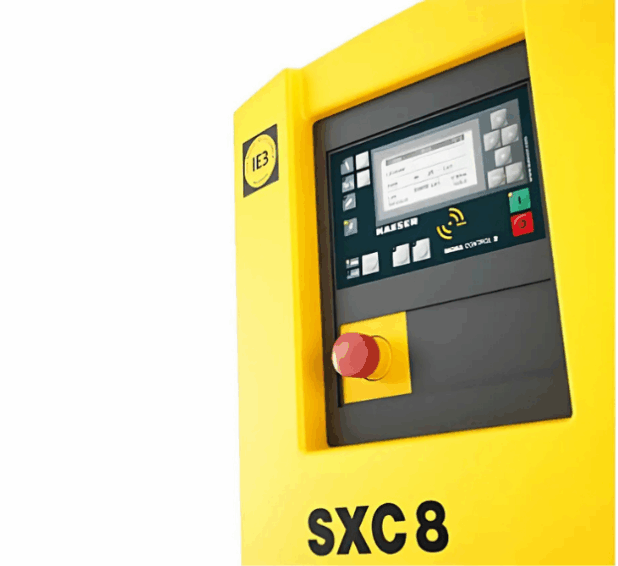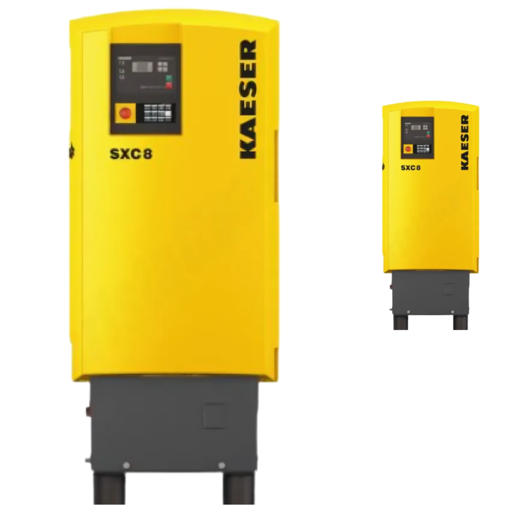 The SXC 8 utilizes a single-stage rotary screw airend with SIGMA PROFILE rotors and cooling-fluid injection.