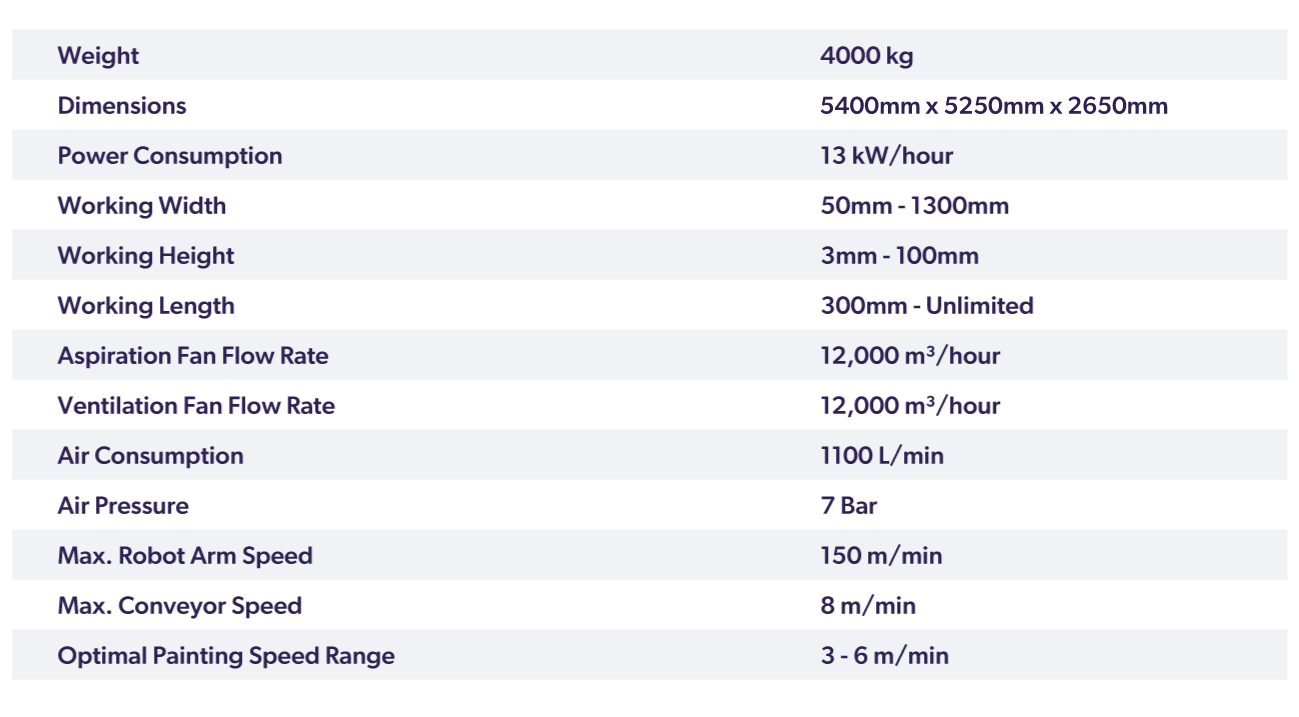 User control is streamlined with a 10-inch touchscreen interface, allowing for real-time monitoring and adjustment of painting parameters. The dual-arm spray system operates on linear rails for enhanced stability, supporting up to eight spray guns and two high-pressure pumps for high-volume applications.