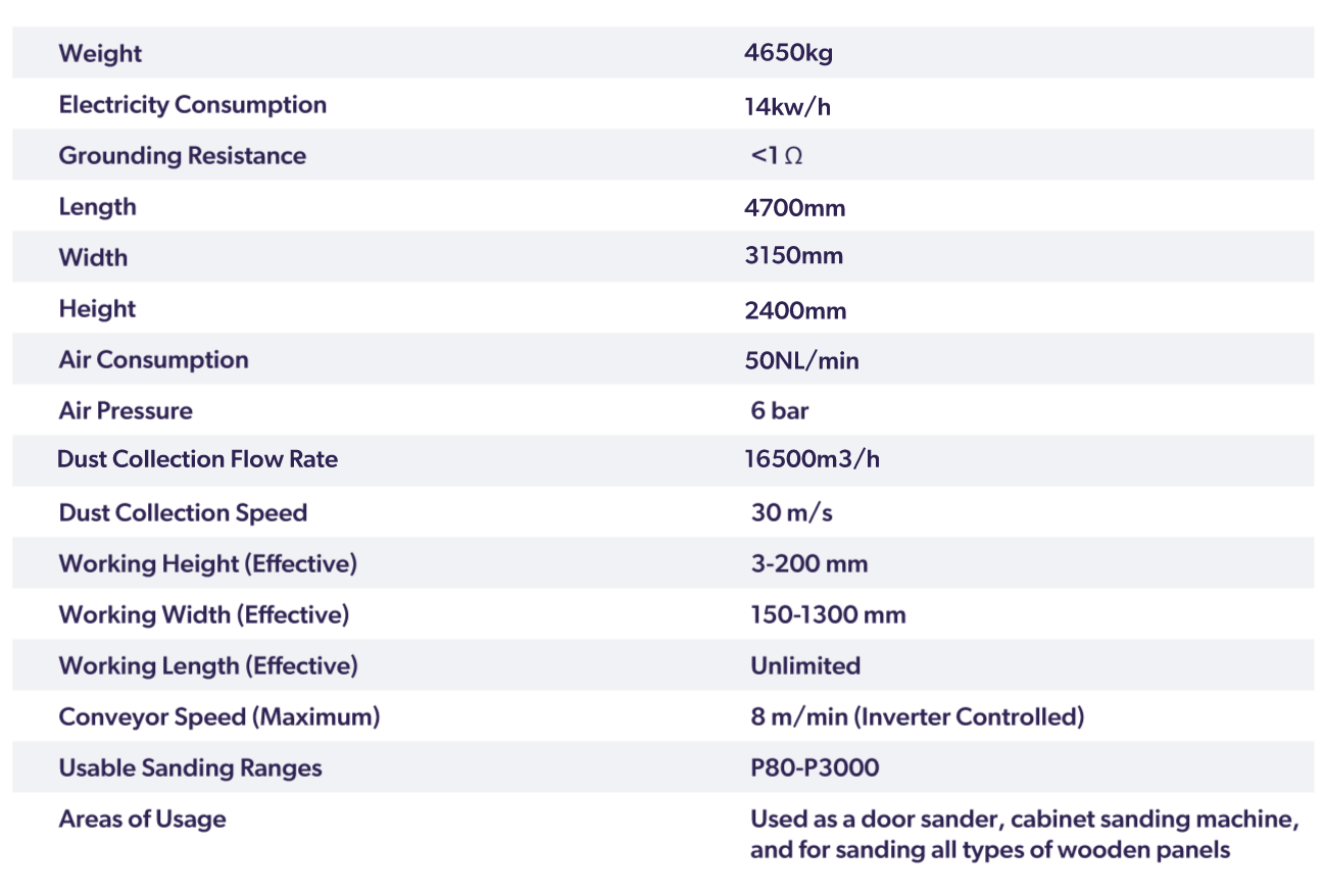 A vacuum conveyor secures pieces with rubber-coated rollers, while an automatic lubrication system maintains smooth operation. Finally, a movable brush unit removes sanding dust before the product exits, ensuring a clean, high-quality finish.