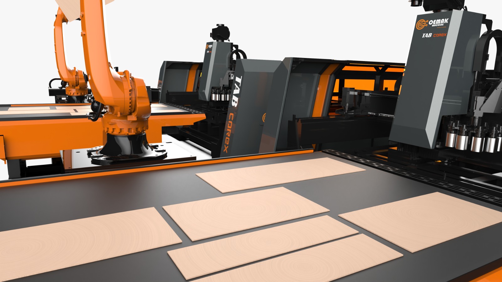The TAB CORE-X is designed as a complete manufacturing line, not just a CNC router with accessories. OEMAK have structured the system around dedicated loading, orientation, conveyor transfer and cleaning modules, so panels progress through each stage of production automatically and consistently. This integrated approach reduces handling, shortens cycle times and brings factory-level discipline to panel processing.